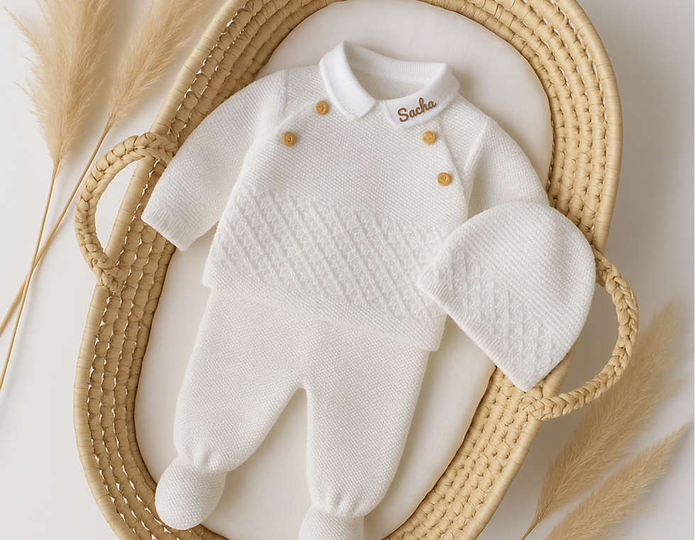 Spécialement imaginé pour la naissance de bébé, cet ensemble mixte est confortable et pratique. En tricot finement travaillé et rehaussé d'un élégant col, c'est le cadeau de naissance idéal avec son joli bonnet assorti.